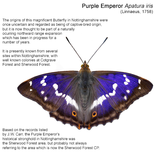 rather than deep amongst the area's ancient Oaks. Although it was always possible that there was an element of under-recording due to this butterfly's arboreal habits, the Purple Emperor was never regarded as a common or widespread butterfly in Nottinghamshire and had seemingly declined to the point of extinction well over a century ago. J.W. Carr's species summary for the butterfly from his book 'The Invertebrate Fauna of Nottinghamshire. Nottingham: J.& H. Bell Ltd (1916)', opens with him stating that 'the Purple Emperor is now very rare and has not been taken recently'. He then continues by stating that 'this may be due to a decrease in the number of local entomologists, rather than a decrease of the butterfly'. Most of the records listed in Carr's book are from woodlands in the northern-half of Nottinghamshire, with Wellow Wood being particularly favoured. Carr states that it 'has been seen and taken many times in parts of the district' [Sherwood Forest]. He goes on to mention that he 'had one in his collection which was taken on Risebrigg Lane near Rufford; and that a few years ago 16 or 17 were seen within the course of a week at Wellow Wood, but only three or four were taken'. In 1859, a 'female was taken inside a pigstye near the edge of Wellow Wood and another was near Mansfield the same year (Brameld)'. |