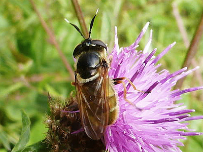 A large species and distinctly 'Bee like'. Described as being "a difficult Hoverfly to find", UK records of Callicera aurata are few and far between, meaning that this record from Dyscarr Wood in August 2014 is significant. This one was found and photographed by Pauline Bradford, who kindly let us use her photograph. | ||