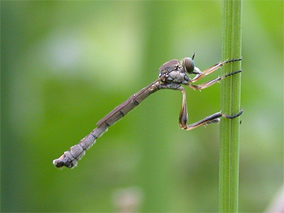 A common and rather unobtrusive Robberfly, usually found among long grass and vegetation. It hunts Aphids and other small insects and perches regularly between darting flights to catch prey, otherwise, the flight is quite weak. Leptogaster cylindrica is apparently commonest in the western-half of Nottinghamshire, although this may be purely down to observer coverage. | |||