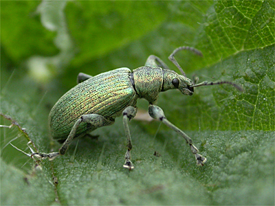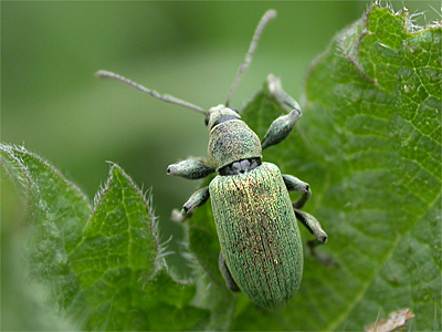 | Phyllobius pomaceus is a common green weevil, found on Nettles in well vegetated habitats. There seems to be great variation in colouration, with some specimens showing a distinct bronze/purple tinge, or green through to blue. The colouration fades with age, being made up of a covering of scales which become worn and eventually rub off. | ||