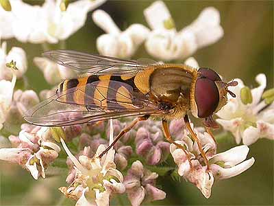 This Syrphus vitripennis, was photographed at Eakring Flash on August 5th 2004 and is one of many hoverflies which exhibit wasp mimicry, through their yellow/black colouration and markings. They are quite commonly seen, but can be hard to seperate from Syrphus ribesii. | ||