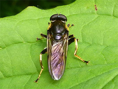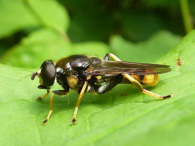 | A fairly large and quite distinctive species, Xylota sylvarum is a Hoverfly of wooded areas. The one illustrated here, was photographed at Dyscarr Wood in the north of Nottinghamshire, by Pauline Bradford, who kindly sent us these photographs for inclusion. | ||