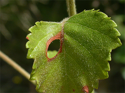 | Status .....Presumed to be an uncommon leaf miner in Nottinghamshire. The larva mines the leaves of Birch (Betula pendula) producing a distinctive mine and oval cut out. | ||