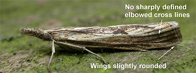 | To be honest, this paring often produces the most confusion. Both species tend to prefer drier habitats, so are commonly encountered around the Sherwood Forest area. Worn specimens can p[rove especially troublesome, but even a very worn Agriphila geniculea (below right) will still show evidence of the sharply defined elbowed cross lines. This is always more clearly defined than on Agriphila inquinatella, which tends to have an inconspicuous cross line made up of a series of dark dashes or streaks. | ||||