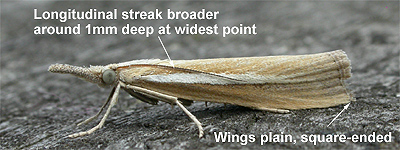 | These are probably the two Crambids people will come across and should be the first ones to learn to identify. Chrysoteuchia culmella (below left) is the larger of the two species, but can often be worn and appear very plain and unmarked. It has two elbowed cross lines,similar to those found on Agriphila geniculea, but are nearly always less distinct. Agriphila straminella has no such cross lines, is smaller and can appear extremely plain and devoid of any markings of note. | ||||