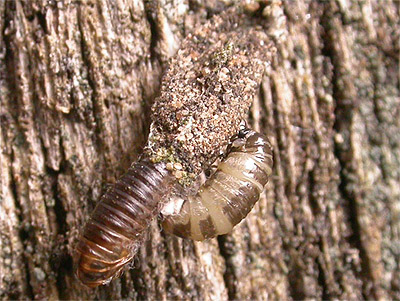 Empty cases are around 15mm in length, cigar shaped, with some insect fragments around the head end of the case and easy to find on the trunks of trees. Smooth barked trees such as Beech are particularly favoured, especially where there is limited ground-cover. Fence posts are also utilised by the pupating larvae on Budby Common, where the species seems to be quite localised. All cases found during the Winter months are from the previous year. Active larvae remain on the ground until the Spring, then climbing trunks to pupate in suitable sites (second week of May in 2006). T. tubulosa is often abundant where it occurs and only the male is fully winged. | ||