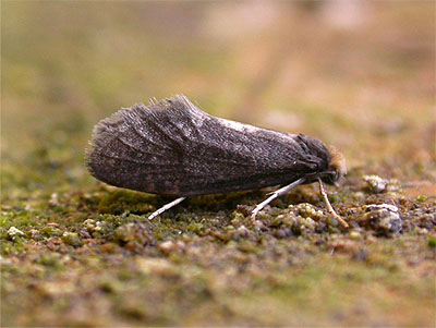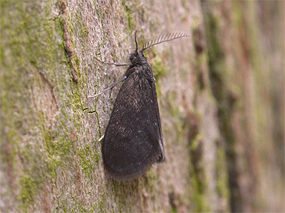 Measuring around 6mm when full grown, Narycia duplicella larval cases are quite distinctive, being covered in particles of lichen and usually having some form of 'fin like' projection towards the rear upper surface and either side of the case. Larvae become active from late February and early March depending on average daily temperature. Sometimes commonly found near the base of tree trunks, Narycia duplicella has been found to be one of the commonest Psychids in Nottinghamshire, occurring on tree trunks and walls in a variety of situations. Both sexes are fully winged. | ||