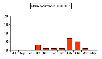 records 1998-2007 By the end of 2007, a total of 20 different Merlin had been recorded and this total was deemed large enough to accurately depict the peak months in which the species is likely to be encountered in the Eakring area. |