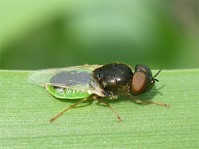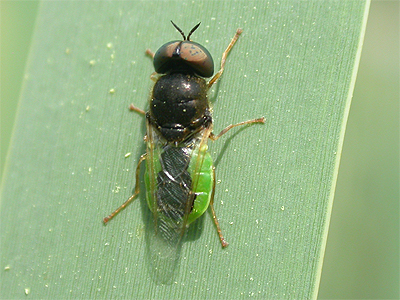| Oplodontha viridula is one of around 50 UK species of Soldier Flies. Easily mistaken at first for Hoverflies, these often brightly coloured insects are frequently found resting on foliage. Sometimes more often known as the Common Green Colonel, Oplodontha viridula is found near water, with the one photographed being present in good numbers on waterside vegetation at Bevercotes Pit Wood in July 2013. | ||