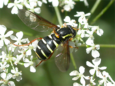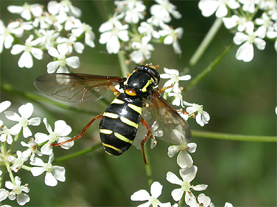 A large and distinctive Hoverfly, but there are several other species to cause identification confusion. This Xanthogramma citrofasciatum was the first ever record for the Sherwood Forest area, when found in May 2013. Predominantly, a southern UK species. | ||