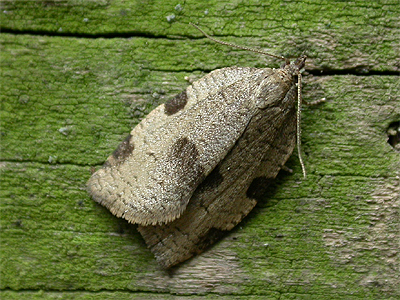 | Status .....Presumed to be quite common across Nottinghamshire, but the lack of records sent in, would lead us to think otherwise. This is a distinctive Tortrix to identify on markings and large size alone. Both these adults were attracted to an outside light at Market Warsop. | ||