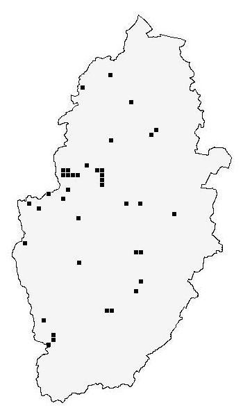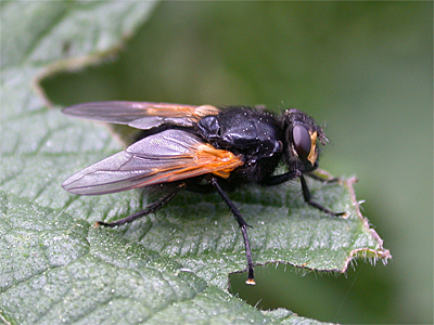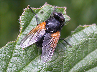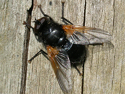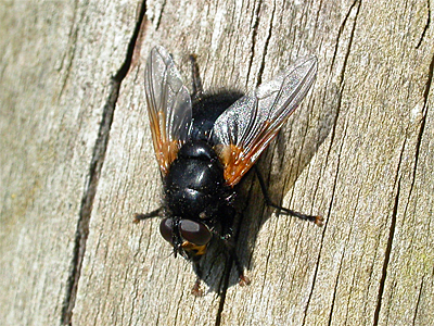A distinctive and large fly, with quite a widespread distribution over most of Nottinghamshire. Mesembrina meridiana is especially common during the late Summer and Autumn, when it is often seen on Ivy flowers or resting in the sun on fence posts and tree trunks etc. Eggs and larval development occurs in dung, so will often be found near cattle. | ||