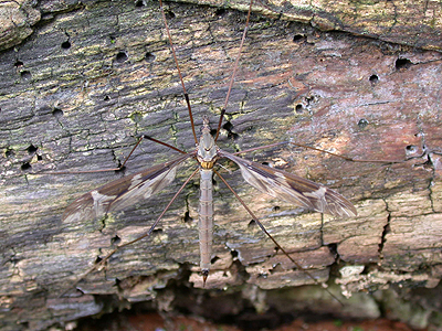 | Many of our Crane Flies are not always easy to identify, there usually being several other similar species affecting identification. However, Tipula maxima is large enough (larger than any of the other regularly seen species) and has wings so well marked, that it makes this Crane Fly an easy to identify species. Tipula maxima is found in well vegetated areas, often in woodlands, so it was a surprise when this one was found on the wall of a Garden Centre at Mapperley in June 2017. | ||