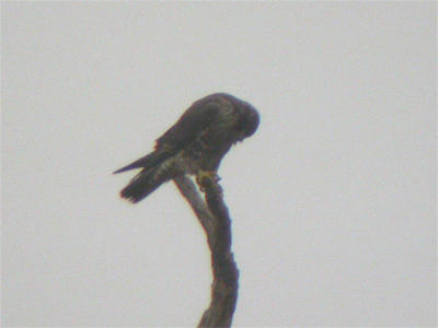 The immature Peregrine showed well late morning at Eakring Flash, making several swoops to try and take one of the four Teal present, before flying off towards Eakring village. Later viewing of the distant photographs taken, showed that the bird is rung on it's right leg, probably with a metal BTO ring. |