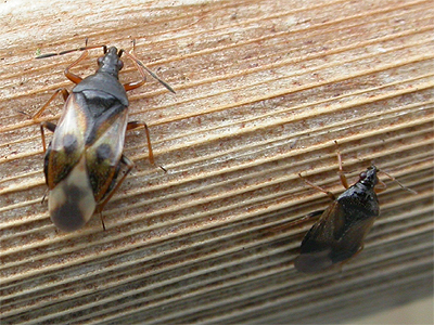 One of a very difficult group of small plant bugs, Orius vicnus can be found on low plants across many habitats. We find them fairly regularly within the old stems of Bulrush, including this one from Eakring Flash in March 2013. The right hand photograph gives a good size comparison with the larger (3.5mm) Anthocoris nemorum (left of the photograph). | ||