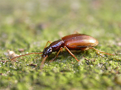 | A small brown Ground Beetle, which was found underneath a log in mid-February 2009 and early March 2013 amongst other occasions. As is the case with many similar species, several were found over-wintering together. A quite distinctive species, which is common across parts of the UK. Length 6.5mm. | ||