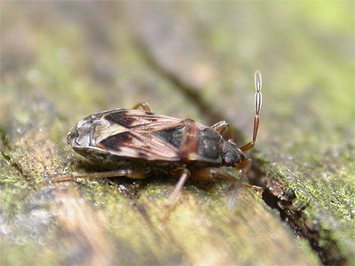 A very small and attractively marked Lygaeid bug. The front femora are swollen and distinct with a low power lens. Unfortunately there are other Scolopostethus species, which add to the identification difficulties. The antennal colouration and pattern can help to a degree, with the first two sections being light, including the basal part of the third. Likely to be common in Nottinghamshire. | ||