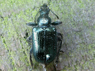 Sherwood Forest NNR Regular visits to the Sherwood Forest area, namely Sherwood Forest CP and Budby South Forest (Birklands and Bilhaugh SSSI) and Clipstone Old Quarter (Birklands West and Ollerton Corner SSSI) have proved productive, with several new species for the site and species recorded for the first time in many years. One of the most attractive species found, has been several adults of the leaf beetle Chrysolina polita (shown right) found on low vegetation at one site in the forest. The striking Rove Beetle Ontholestes tessellatus was just one of a range species which were attracted to carrion (rarely found in the forest) at Clipstone Old Quarter. Although not entirely pleasant to deal with, carrion (a dead cat in this instance) proved to be a relative gold mine for species,which would perhaps be very difficult to find otherwise. |