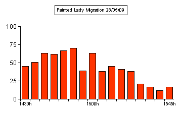 decrease Painted Ladies still continuing to move through Eakring this afternoon. A one hour sample count, again divided into five minute periods, produced a maximum of 24 through between 16:05 and 16:10h. The majority of butterflies were heading more or less into the wind today and going north-east, but there were smaller numbers which continued to fly west. 191 through in an hour, would still represent an amazing Spring count, away from 2009. |