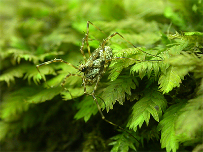 trunks of lichen and moss covered trees it favours. We looked in many woodlands searching for this elusive Harvestman, eventually finding it in an area of coppiced woodland at Wellow Park in June 2012. It was found again this year and when we checked the same habitat type at Gamston Wood near Retford, quickly found Megabunus again. There are still only a handful of known sites in the county, but any damp coppiced woodland is worth searching. Typically, they are located about a metre from the ground. |
