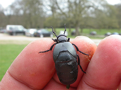 Nottinghamshire site by James Glendenning. We visited the site the next day and following a short survey of the area, soon located a total of five males and four females. Unfortunately, these were the only live beetles we found and the dead numbered over 25. At first we were not going to publish the location of the find, but as the discovery centred around the car park and cricket pitch area of Newstead Abbey, felt that public awareness may indeed be the best way of offering some form of protection to the colony. After a string of emails were circulated to various organisations (including Nottingham City Council who manages the area) informing them of the Oil Beetles presence and need of protection, we visited Newstead Abbey again on May 8th, with Ian Major from the Sherwood Forest Trust. |