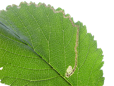 | Status .....Probably fairly common on Elm in Nottinghamshire. The larval exit hole is on the underside of the mine. | ||