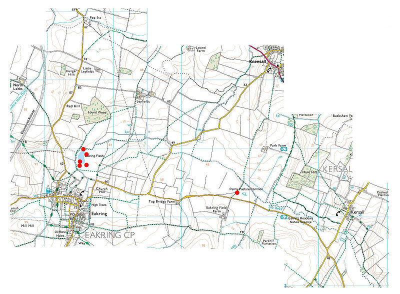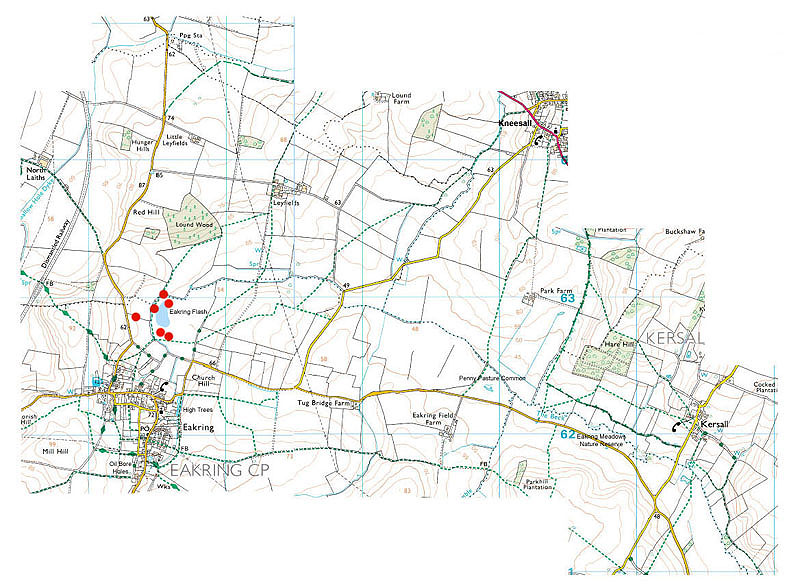 Breeding birds became totally restricted to Eakring Flash, after breeding there for the first time in 1999. Following the destruction of suitable nesting habitat at Penny Pasture Common by cattle grazing in early 2003, all breeding became restricted to Eakring Flash. Singing males have taken up territories elsewhere at Eakring Meadows and once in ditches at Church Hill and Eakring Field Farm in 1998, but these were isolated instances. | |