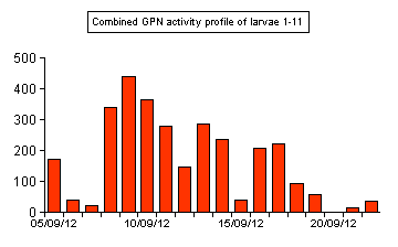 Clicking on the column headings (Larva 1, 2, 3 etc) in the tables below, will link to more detailed daily results for that larva. | ||||||||||||||||||||||||
