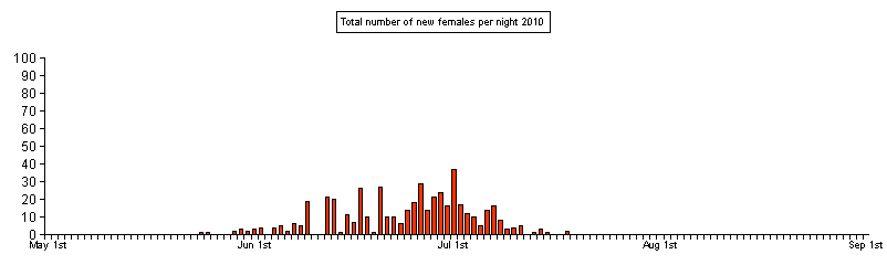 second week of June. The second week of June is significant at this site at least, as it marks (with regularity) a sudden emergence of females. This year was no exception and can be seen in the first of the following set of graphs, showing the daily totals of males and females during 2012. A large emergence of females occurred on June 15th (30f) 2012, but there was a significant (though smaller) rise in the number of new females appearing on June 10th (18f). Both these dates fit in remarkably well with similar emergences in previous years of June 9th (47f) and 12th (50f) 2011, June 12th (21f) 2010 and June 8th (63f) 2009. What we don't know is whether large emergences of females occur at other UK sites, or even other sites in Nottinghamshire at around the same time. |