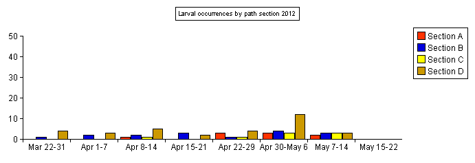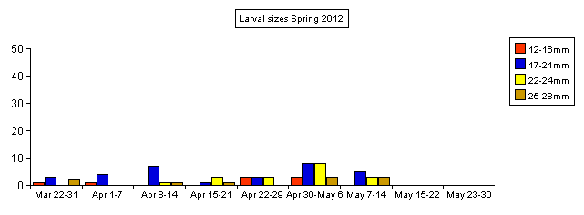 The low numbers were similar to those resulting from surveys in 2009, but the size ratios between 2012 and 2009 are different. Perhaps the most interesting comparisons can be made between 2012 and 2011. Apart from the fact that the number of larvae recorded in both years is extremely different, larvae recorded in 2011 were clearly more advanced in growth during the early weeks of surveying, than they were this year. This is indicated by the lower number of larvae within the two larger size ranges used in the graphs in 2012. Because larvae were more advanced in March and April 2011, that (and favourable weather during the same period) will account for the early season that year. | ||