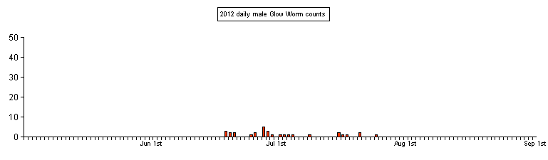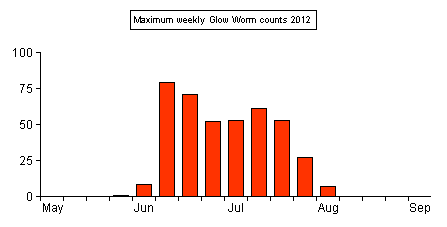 Glow Worm survey results and 2012 data Despite the low numbers of larvae recorded during our March, April and May surveys, surveying for the first adult females commenced on the early date of May 2nd, with the hope of beating last years early date of May 13th 2011. After all, we had recorded a full grown female larva in late March, so an early emerging female was not entirely out of the question. With a very wet April and early May, it was hardly surprising that it was not until May 30th that Female 001 appeared at the top of section D. First dates for females over the past four years here, have been recorded as follows - May 27th 2009, May 24th 2010, May 13th 2011 and May 30th 2012. Female 001 (F001) on May 30th, turned out to be the first of 599 females to be found during the course of the season, a season that ended with the last appearance of F566 on August 6th. This was a surprisingly large total, given the low number of larvae we had recorded earlier in the year. The 2012 season was eventually notable for several reasons - an unexpectedly high female count, a higher than average number of females recorded each night and a lack of males recorded in cop with females. |