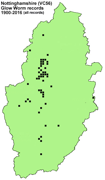 has been too detrimental. The county map began to take further shape, when we added red dots to show sites that have produced records since the turn of this century. The lack of red dots was alarming, but has started to prove that this is a beetle in decline and a serious one at that. News of a new Glow Worm site discovered in Clumber Park during July was very welcome and the only new site found this year. Clumber Park is certainly one of the county's three main areas for Glow Worms, the others being Clipstone Forest and the Sherwood Forest NNR. |