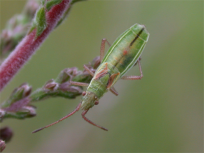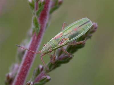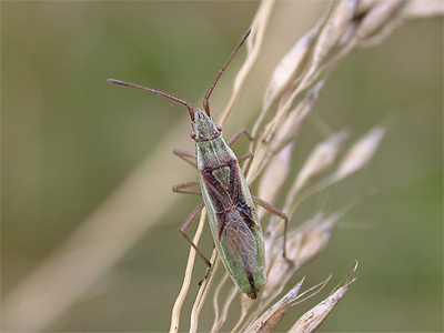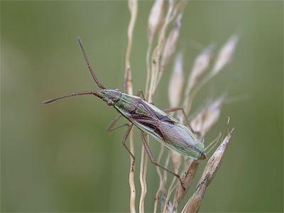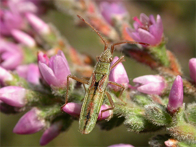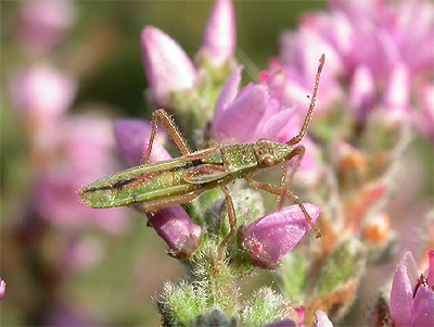 A common bug of grassy areas and heathland, being either brachypterous (short-winged) or macropterous (fully-winged). There are two colour forms of the male - either brown or green, but the female is always green. Belonging to the Rhopalidae family, these bugs are closely related to Squashbugs, with just 11 species in the UK. | ||