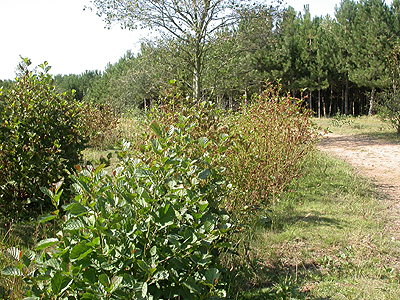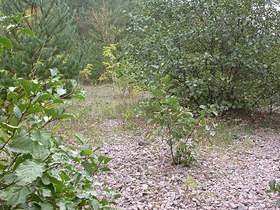 Gedling Country Park. Several years after closure, the spoil heaps of all of Nottinghamshire's former Collieries were topped with a stone aggregate and soil, then planted with a mix of both deciduous and coniferous trees. The range of deciduous trees included Alder (Alnus glutinosa) and other species of Alnus. Small trees and young regenerative growth are generally most favoured by Agelastica alni, but these soon become stripped of foliage in cases of large numbers of both adults and larvae. As seen at Manton Pit Wood in September 2015 and each subsequent year. Replacement leaf growth is attacked later in the Summer/Autumn, with adults moving to other Alders as food supply becomes short. Left: Agelastica alni damage to regenerative Alder growth at Manton Pit Wood in September 2015. The Alder in the foreground was untouched. |