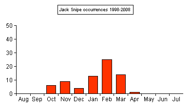 chart on the right shows. Woodcock were found at Hare Hill Wood on the 9th and then the next day at Penny Pasture Common (10th) and what was possibly the same bird, was seen flying onto Penny Pasture Common at dusk on the 17th. After what has been the worst Winter for Golden Plover here, it was nice to find a flock of approximately 198 in fields at Church Hill and Tug Bridge Farm on 17th. |
