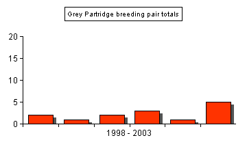 The table above shows the scarcity of Grey Partridge in the area since 1998. Although numbers do remain extremely low, there were distinct signs during 2003 that a comeback is likely over the next few years, after five pairs were found to be breeding. |