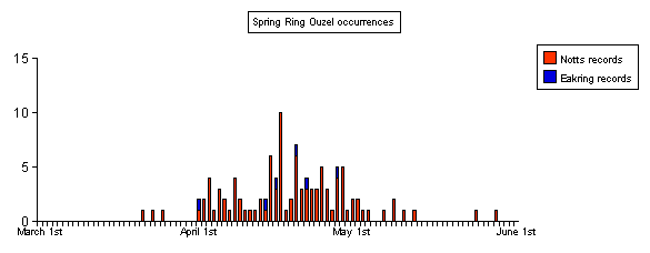 (24th) was in line with previous years. The timing of the first Ring Ouzel (to a greater extent) in the Midlands rather than just Nottinghamshire, usually coincides with the first migrant Wheatears and it still remains surprising that there have been few March records of Ring Ouzel. |
