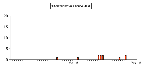the end of the month. It is likely that the late April Wheatear records of 2003, would correspond to those turning up during May in previous Springs. However, because of little coverage during May, this is only supposition at this stage. |