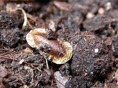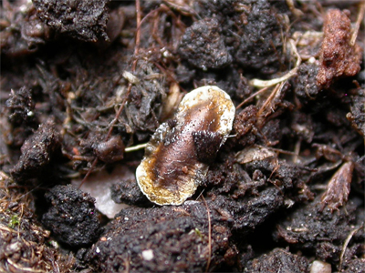 Pupal case among leaf litter, after cut out from the leaf. Photographed October 2025. | ||