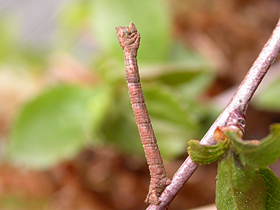 Part-grown larva in process of moulting (15mm length) on Blackthorn Prunus spinosa. Photographed at Eakring Meadows, April 2023. | ||