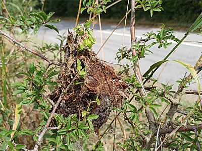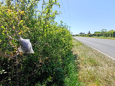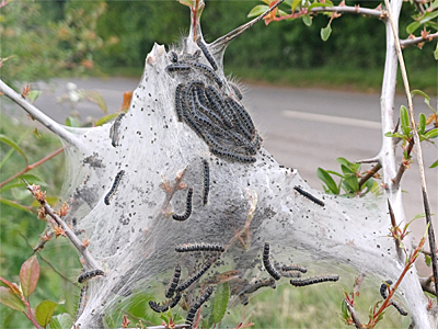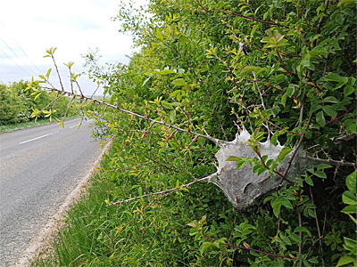 | It was certainly an experience, to drive around the Nottinghamshire countryside looking for such a rare moth on roadside hedgerows. How often do you get the chance to do that? But that's how I found many larval webs, simply seeing them as I drove by (they are that conspicuous) then parking up and walking back to confirm. That's how I found the larval web below left, which was one of two within close proximity along the busy A6075 near Tuxford. These webs were both on Hawthorn, which was used as the hostplant 33% of the time, based on those records where the hostplant was given. | ||