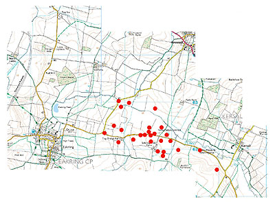 country. The first calling Quail this year, was in Oil Seed Rape at Eakring Field Farm from May 26th, (arrival at same site in 1998 being May 20th) with a second bird present at nearby Parkhill Plantation from May 29-June 7th. On June 8th, a third bird was discovered in the Eakring Meadows area, calling distantly from the stubble field opposite the Kersall end of the reserve. This bird was rarely noted after it's initial discovery. June 10th saw another influx take place, when a total of seven birds were found calling at Eakring Field Farm, Parkhill Plantation, Penny Pasture Common.and two sites along the Kneesall Road. By the 18th, some nine males had been located. Positional mapping of these males, helped to determine their movements and territories during this time. Checking sites away from roadside locations proved fruitful on the 20th, when two more males were located in the sprayed set-aside to the south-east of Eakring Field Farm. These, with a further two new arrivals by the roadside in front of the farm, mean that at that time, some 14 males had been located in the area (seven of which were now situated at Eakring Field Farm) Some movements by certain males were suspected to have taken place. Two of the Tug Bridge Farm birds, were considered to be accountable for the new males which arrived at nearby Eakring Field Farm. This theory was dispelled however, when all the original Tug Bridge Farm birds, plus one new arrival began calling again on June 25th. What was now clear though, was that despite failing to call for many days, males remained in territories attained on arrival, rarely venturing more than fifty yards or so. |