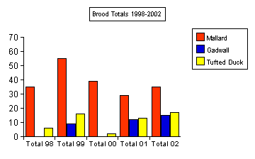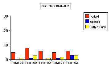 breeding pairs. Breeding wildfowl in 2002 2002 was a year of continued success for most species. There were also some surprises in the form of first time proven/actual breeding attempts by Mandarin, Shelduck (Eakring Flash) and Little Grebe (Kersall). Ruddy Ducks remained in the area throughout the Summer, but again failed to produce young, although breeding was certainly attempted and probably for the second consecutive year. Shown in the two tables below are the breeding wildfowl pair/brood counts for the area since 1998. Whilst breeding totals of Mallard have remained reasonably consistant in the five study years, there has been a slight increase in numbers of both Tufted Duck and Gadwall. 2002 saw three pairs of the latter species breed: quite a feat considering water size here compared to other larger waters within the county. |
