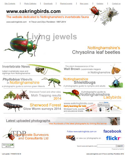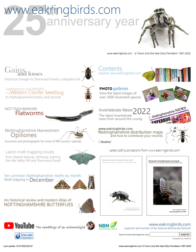 | Our local patch became the whole of Nottinghamshire, but especially the Sherwood Forest area, and the diversity of our interests began to encompass many other invertebrate orders. These included most of those neglected over time, by Nottinghamshire's entomologists for decades and even longer in some instances. Of course over that time the website changed and further developed in these new directions. | ||