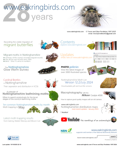 to the (slightly) new look eakringbirds.com Well there's nothing like a freshening up of things and with people browsing and researching on the internet less now than ten years ago, I thought it was time to change the website a little, to make it easier to navigate and to have a good old fashioned tidy up and a little facelift. It also means I have a lighter workload and I'm not continually struggling to update pages, so only a few are updated on a regular basis now. Doubtless there'll be a few glitches (mostly bad links) to fix, but hopefully not too many. Currently in its 28th year, eakringbirds.com continues to be written and illustrated by Trevor and (the late) Dilys Pendleton. The website remains the most comprehensive, online resource for Nottinghamshire invertebrates, despite the perhaps confusing ornithological aspect to the name. But there are still many pages devoted to the ornithological fauna from the Eakring and Kersall area, which formed the basis on which this website was originally founded back in late 1997. As mentioned, there has been some recent streamlining and tidying (Oct 2025) but there's still a range of archived bird-related pages available. |